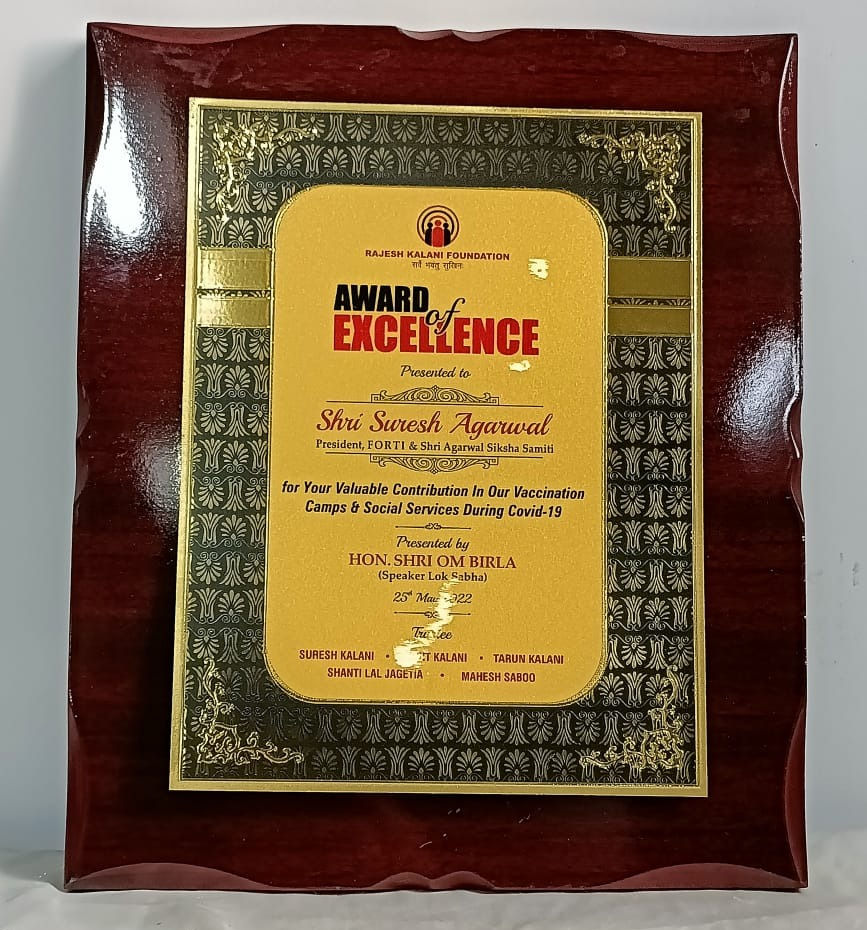 Mr. Suresh Agarwal was felicitated with “The Award of Excellence” for his contribution to vaccination camps and social service during COVID-19 by Shri Om Birla, Speaker Lok Sabha at the event organized by Rajesh Kalani Foundation.